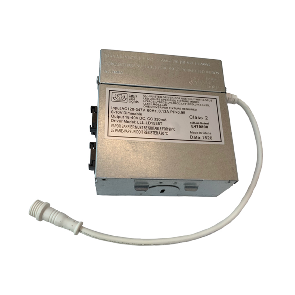 The LLL-LD1535T is a 120-347V, 0-10 dimmable driver option for the Lotus LED LL4R / LY4RCS / LL4S / LY6RCS / LY6S / LRG6 / LRG6-6RSL / LL4G-HO / LRG4-HO Models recessed downlights. The 120V driver will be replaced with this 120-347V driver before shipping.
