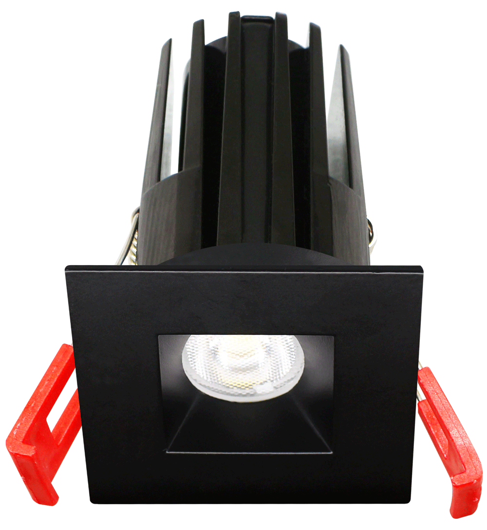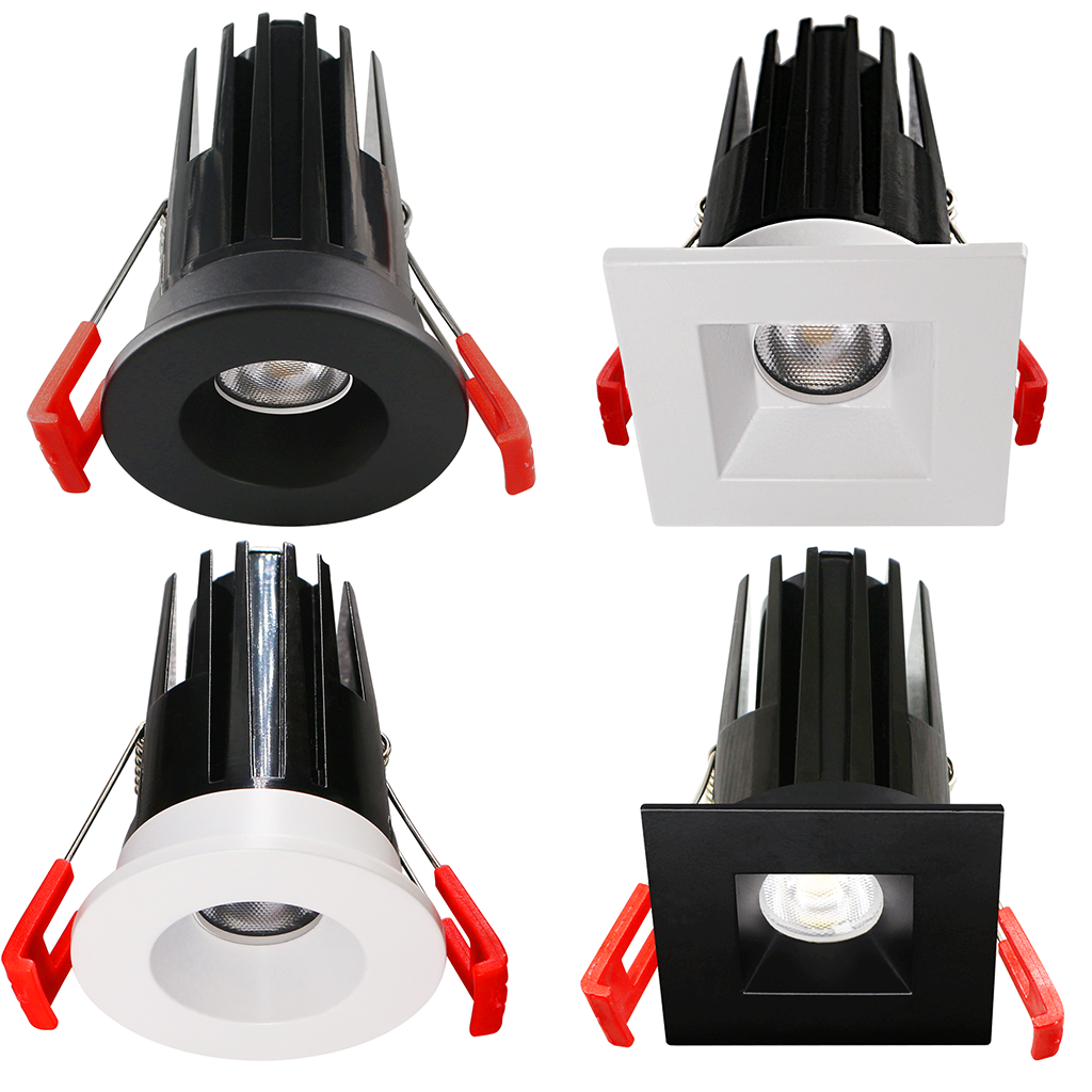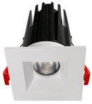 2″ Recessed LED fixture with interchangeable round and square, white and black trims.